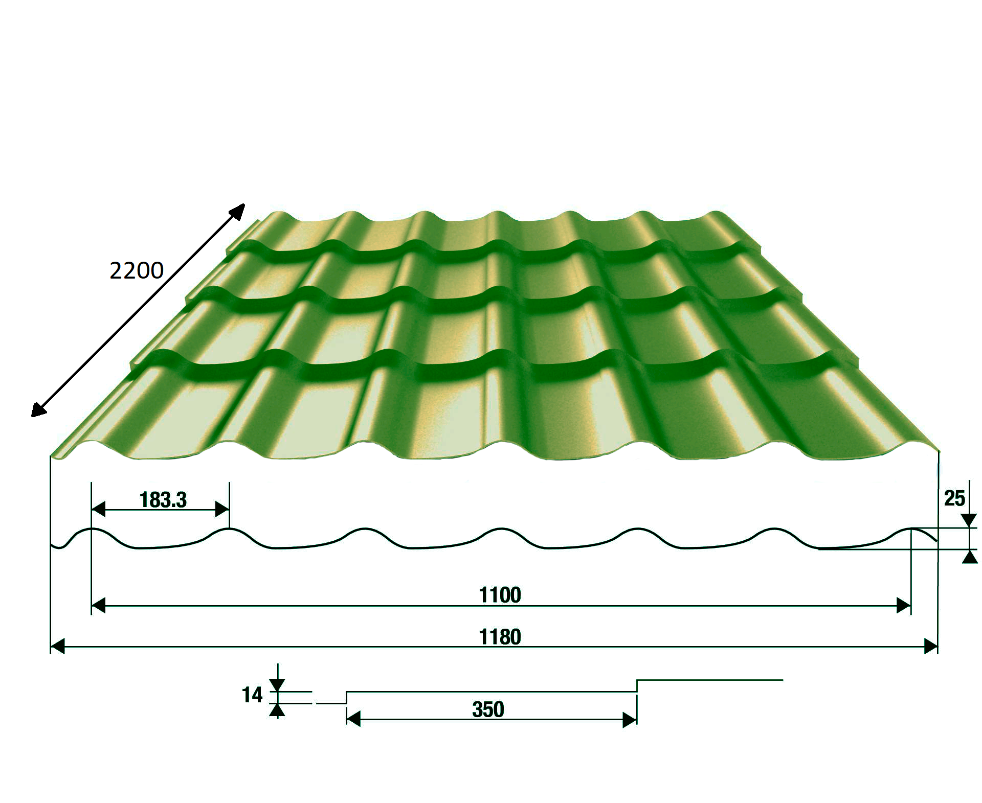 Листы металлочерепицы выполнены из оцинкованной стали толщиной 0,4 мм.Продукция устойчива к атмосферным воздействиям и имеет хорошие показатели цветостойкости и пластичности.Металлочерепицу укладывают на скатные кровли жилых и общественных зданий.Монтаж осуществляется непосредственно на металлическую или деревянную обрешетку: листы металлочерепицы крепятся оцинкованными саморезами в прогиб волны в местах соприкосновения с обрешеткой. Производитель не рекомендует использовать углошлифовальную машину для резки листов, иначе можно повредить покрытие и подвергнуть их интенсивной коррозии.