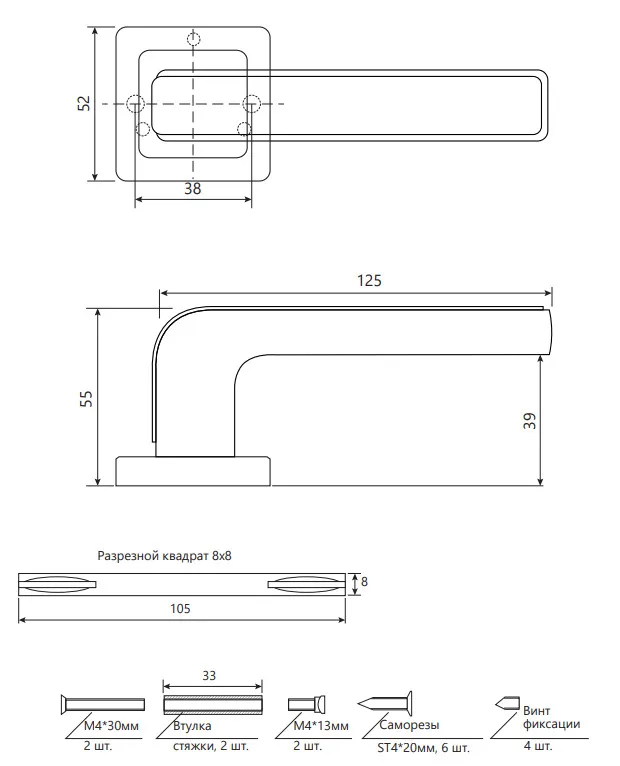 Размер сечения квадрата ручки - 8 мм. Длина 105 мм.