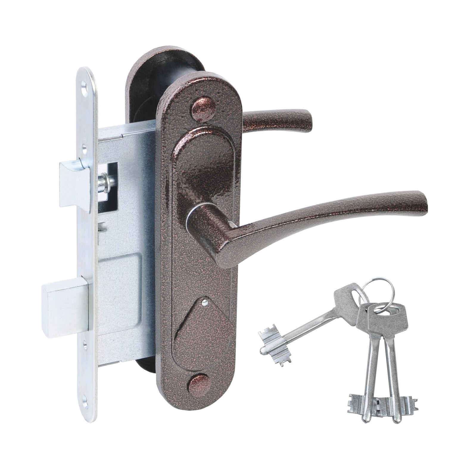 Замок врезной с ручками. Предназначен для установки в деревянные двери толщиной до 45мм, правого и левого открывания. Ригель прямоугольного сечения, вылет 22мм. Универсальная защелка. Стальной корпус, покрыт гальваническим покрытием. Межосевое расстояние 67 мм. Удаление ключевого отверстия 55мм. Материал ручек алюминиевый сплав. Ручки оснащены пружинами возврата. Комплектация: замок, 3 ключа, ручки, ответная планка, винтовые стяжки.