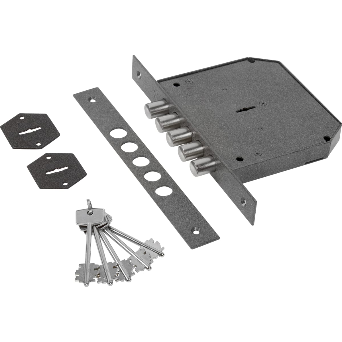 Замок врезной «ЭТАЛОН» предназначен для установки на распашную дверь, которая открывается вправо/влево. Подходит для ворот, решетки, гаража, погреба или входной двери. Надежная сувальдная система обеспечивает высокую степень защиты. Материал замка и ключей — сталь, антикоррозийная обработка защищает механизм при неблагоприятных условиях эксплуатации, увеличивая срок службы. Лицевая планка в форме прямоугольника аккуратно обрамляет отверстие для ключа. В комплект входит запорная планка и 4 ключа.