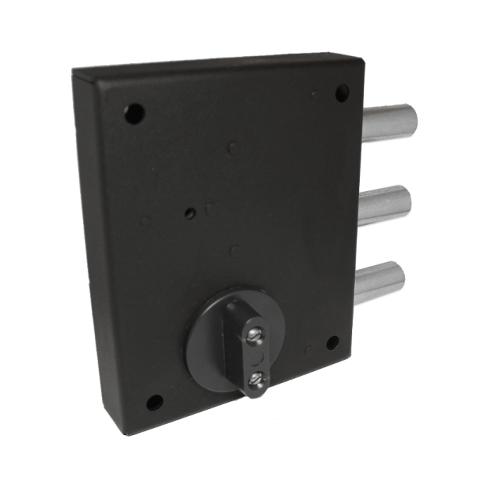 Замок запирается одним ключом (сначала выдвигаются ригели, а затем через другую скважину запирается секретный механизм), изнутри закрывается вертушкой (постоянный ключ).
