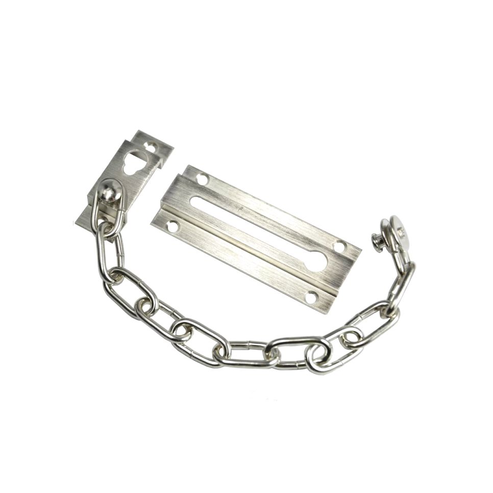 Цепочки для дверей цвета «хром» – это приспособление, при помощи которого можно открыть дверь на безопасное расстояние, предотвратив тем самым попадание в помещение незваных гостей. Изготовлены из высококачественной стали, которая выдержит самый большой напор извне. Устанавливаются они достаточно просто: коренной блок крепится к раме, а рейка-полоз – на двери напротив так, чтобы цепочка немного провисала, когда дверь закрыта.