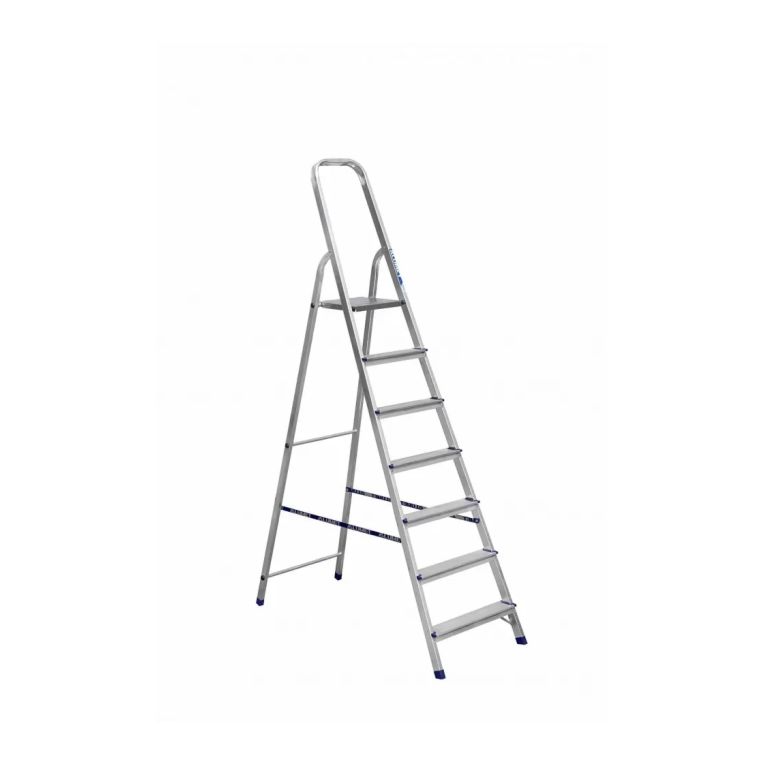 Алюминиевая стремянка на 7 ступеней одинаково хорошо подходит и для бытовых нужд, и для производства, где требуется часто работать на высоте до 3,5 м. Благодаря использованию алюминия, вес лестницы составляет всего 5,74 кг, а в сложенном виде она практически не занимает места.