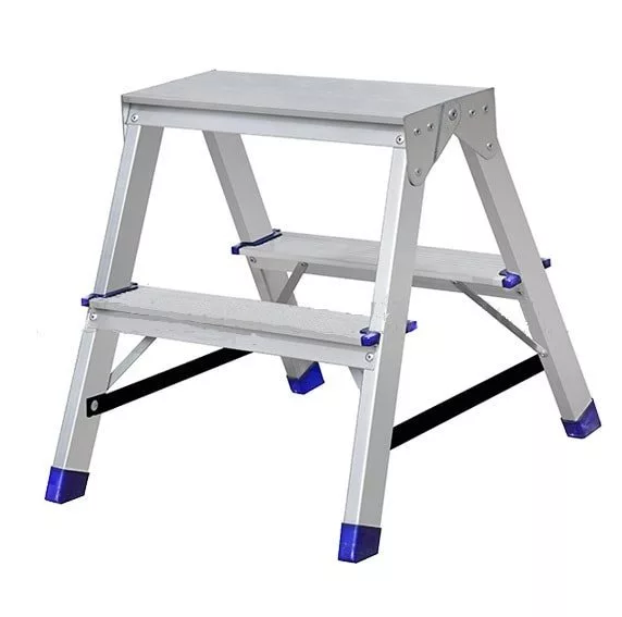 Двухсторонняя стремянка из алюминия на 2 ступени очень удобна как для выполнения различных садовых работ, так и при ремонте. Прочные поперечные ремни придают конструкции дополнительную устойчивость, не позволяя ножкам разъезжаться даже при высокой нагрузке.