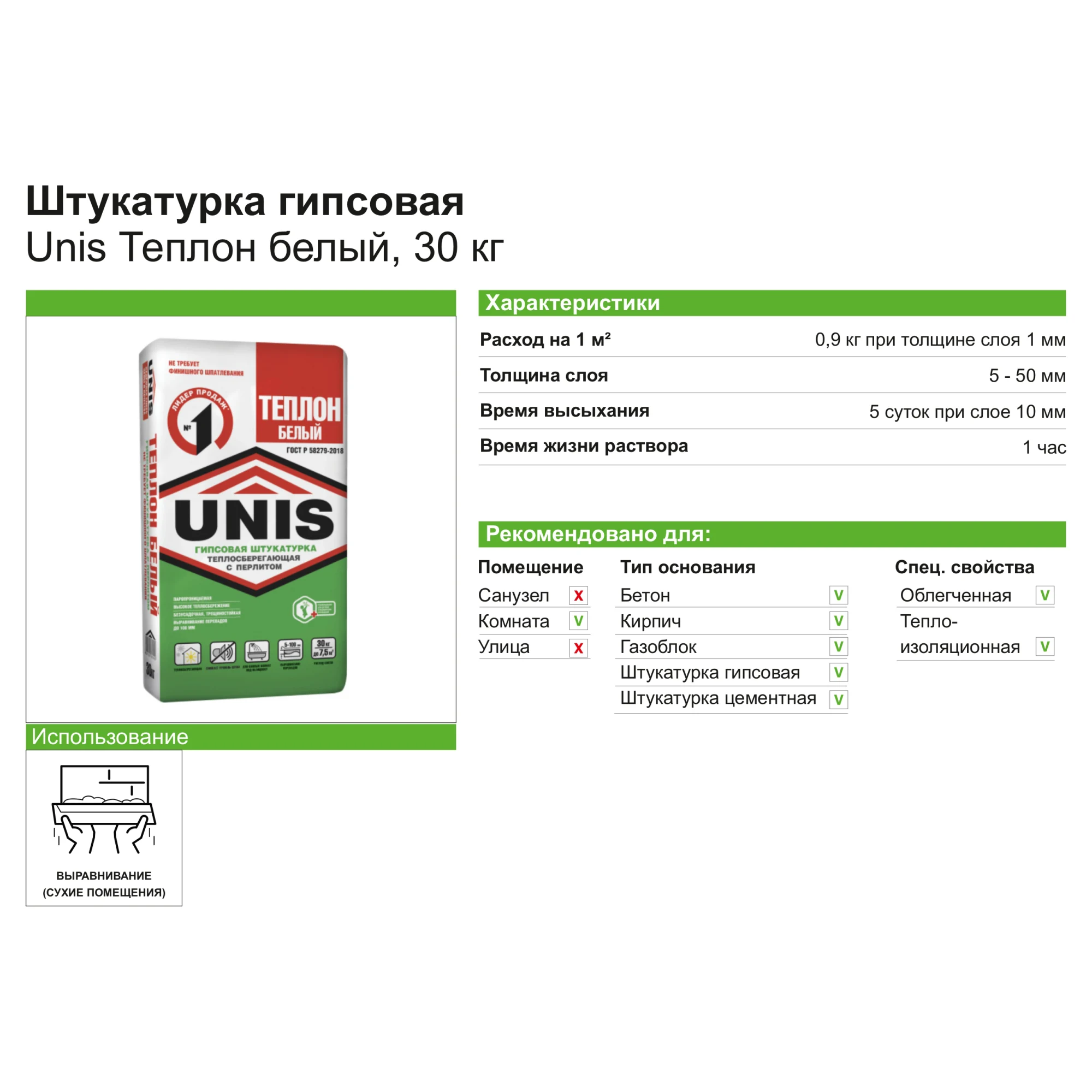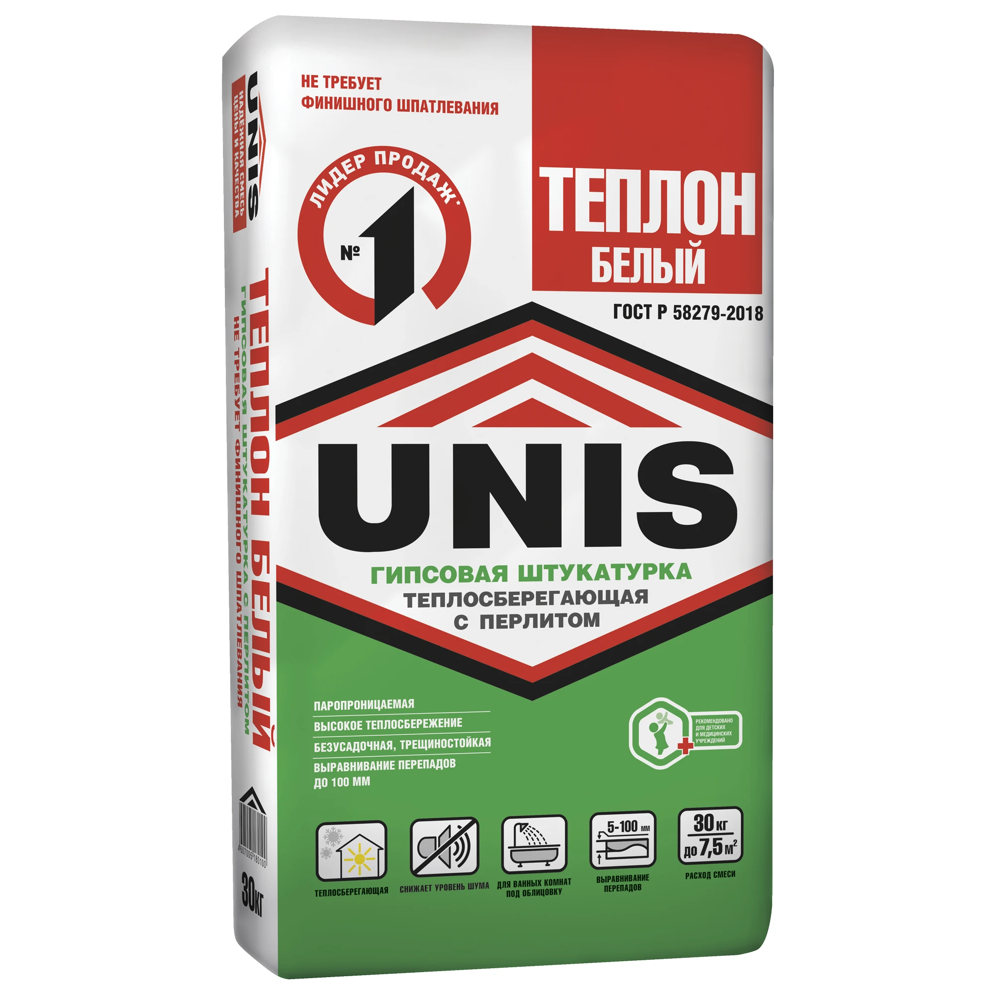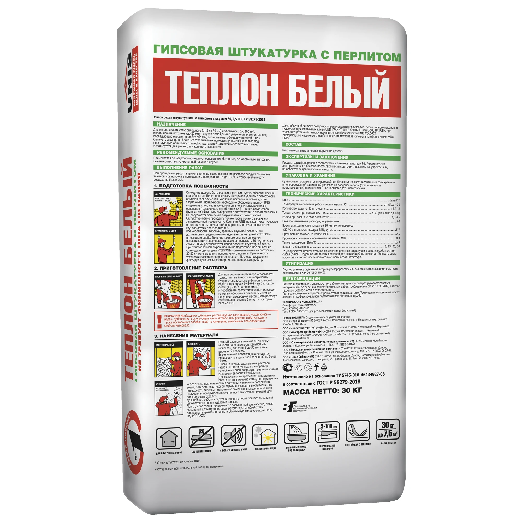 Штукатурка гипсовая белая «UNIS Теплон» (30 кг) подходит для внутренней отделки стен и потолков. После высыхания образует ровную глянцевую поверхность и не требует нанесения шпатлевки. Входящий в состав смеси перлит делает ее легкой и увеличивает теплозащитные характеристики.